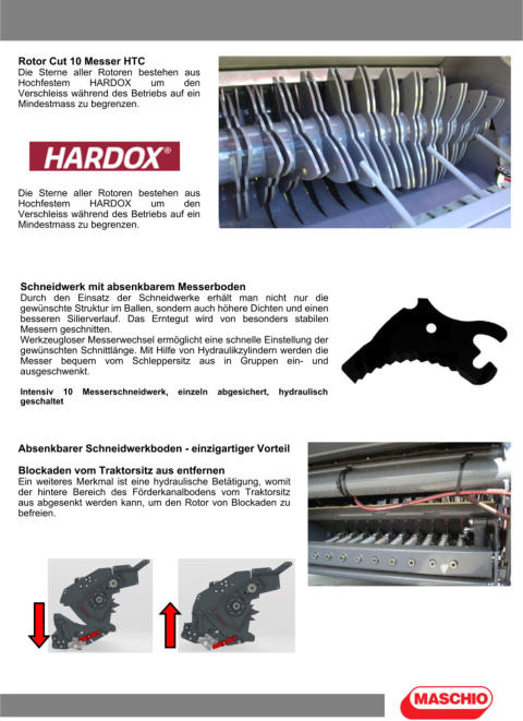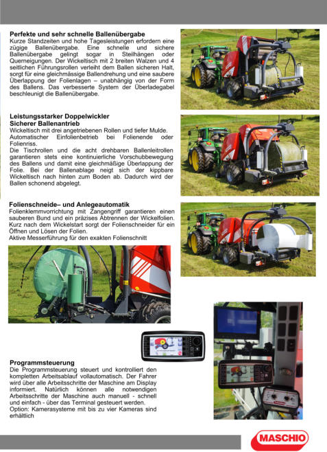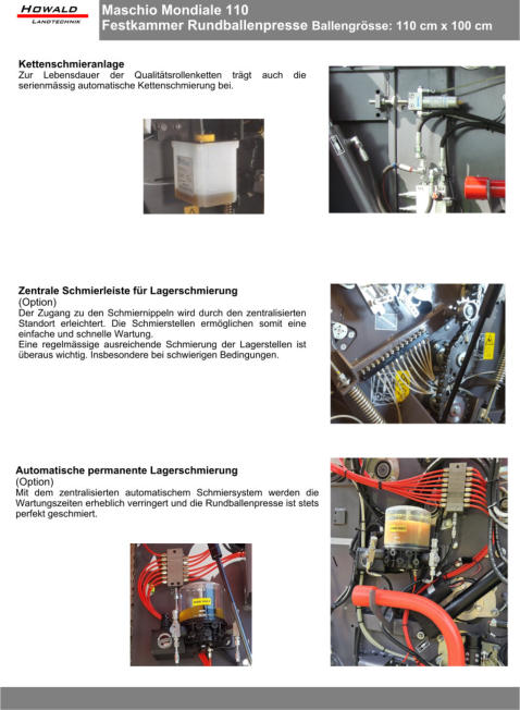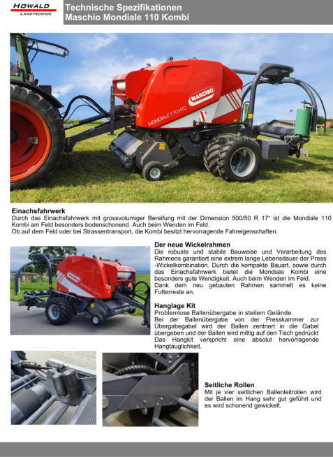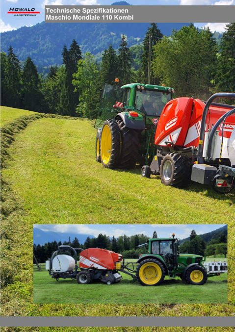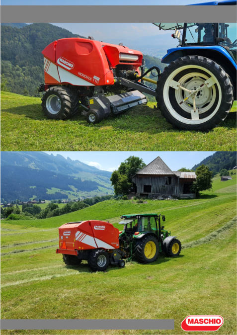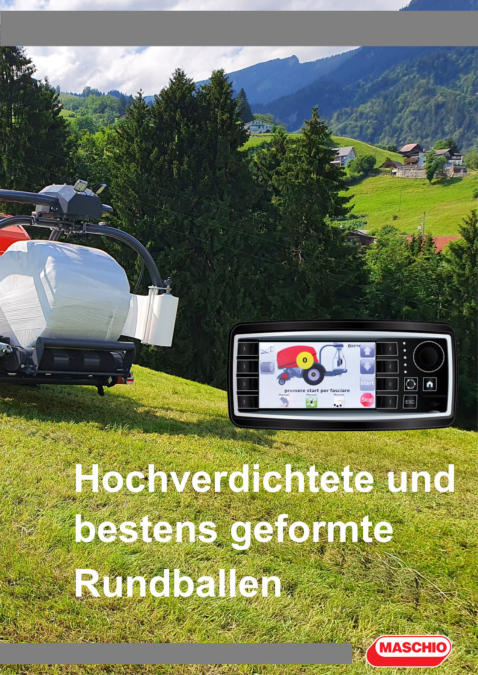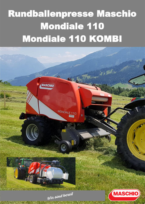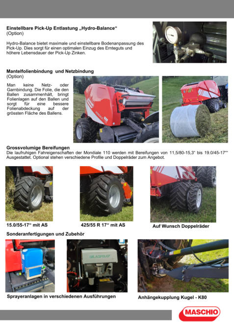 Alpin  -  Pendel Pick-Up  (Option)  Durch eine geänderte Aufhängung entsteht ein Pendelbereich von 160 mm. Dieser ermöglicht eine optimale Bodenanpassung und gleicht Unebenheiten Rollenniederhalter  (Option)  Rollenniederhalter mit einer - oder doppelter Rolle. Dies sorgt für einen optimalen Einzug des Ernteguts. Kunststoffabstreifer  (Option)  Diese Abstreifer halten stärksten Beanspruchungen stand, verbiegen sich nicht bei einem Zusammenstoß mit Fremdkörpern und sind unverwüstlich. Die vorteilhafte Abstreifwirkung der Zinken verbessert zusätzlich den Gutfluss. Breitaufsammler Feinverstellbare Stützräder in Verbindung mit einer federentlasteten Hebevorrichtung lassen den Pick-Up geradezu über die Wiese schweben. Verunreinigungen des Futters sind so gut wie ausgeschlossen. In Kugellagern geführte Träger mit eng stehenden, in elastischen Federtaschen montierten Zinken, zusammen mit einer in einem Spezialverfahren hergestellten Kurvenscheibe, ergeben einen Pick-Up, der nicht nur in Bezug auf seine enorme Breite, sondern auch auf seine ausserordentliche Haltbarkeit einzigartig ist. Sonderausrüstung zu Rundballenpressen Maschio Mondiale 110  Einstellbare Pick-Up Entlastung „Hydro-Balance“  (Option)  Hydro-Balance bietet maximale und einstellbare Bodenanpassung des Pick-Up. Dies sorgt für einen optimalen Einzug des Ernteguts und höhere Lebensdauer der Pick-Up Zinken. Sonderanfertigungen und Zubehör Grossvolumige Bereifungen Die laufruhigen Fahreigenschaften der Mondiale 110 werden mit Bereifungen von 11,5/80-15,3“ bis 19.0/45-17““ Ausgestattet. Optional stehen verschiedene Profile und Doppelräder zum Angebot. 15.0/55-17“ mit AS 425/55 R 17“ mit AS Auf Wunsch Doppelräder Sprayeranlagen in verschiedenen Ausführungen Anhängekupplung Kugel - K80 Man keine Netz- oder Garnbin-dung. Die Folie, die den Ballen zusammenhält, bringt Folienla-gen auf den Ballen und sorgt für eine bessere Folienabdeckung auf der grössten Fläche des Ballens. Mantelfolienbindung  und Netzbindung (Option) Zentrale Schmierleiste für Lagerschmierung  (Option) Der Zugang zu den Schmiernippeln wird durch den zentralisierten Standort erleichtert. Die Schmierstellen ermöglichen somit eine ein-fache und schnelle Wartung. Eine regelmässige ausreichende Schmierung der Lagerstellen ist überaus wichtig. Insbesondere bei schwierigen Bedingungen. Automatische permanente Lagerschmierung  (Option) Mit dem zentralisierten automatischem Schmiersystem werden die Wartungszeiten erheblich verringert und die Rundballenpresse ist stets perfekt geschmiert. Kettenschmieranlage Zur Lebensdauer der Qualitätsrollenketten trägt auch die serienmässig automatische Kettenschmierung bei. Absenkbarer Schneidwerkboden - einzigartiger Vorteil  Blockaden vom Traktorsitz aus entfernen Ein weiteres Merkmal ist eine hydraulische Betätigung, womit der hintere Bereich des Förderkanalbodens vom Traktorsitz aus abgesenkt werden kann, um den Rotor von Blockaden zu befreien. Schneidwerk mit absenkbarem Messerboden Durch den Einsatz der Schneidwerke erhält man nicht nur die ge-wünschte Struktur im Ballen, sondern auch höhere Dichten und einen besseren Silierverlauf. Das Erntegut wird von besonders stabilen Mes-sern geschnitten. Werkzeugloser Messerwechsel ermöglicht eine schnelle Einstellung der gewünschten Schnittlänge. Mit Hilfe von Hydraulikzylindern werden die Messer bequem vom Schleppersitz aus in Gruppen ein- und ausge-schwenkt.  Intensiv 10 Messerschneidwerk, einzeln abgesichert, hydraulisch ge-schaltet Rotor Cut 10 Messer HTC Die Sterne aller Rotoren bestehen aus Hochfestem HARDOX um den Ver-schleiss während des Betriebs auf ein Mindestmass zu begrenzen. Die Sterne aller Rotoren bestehen aus Hochfestem HARDOX um den Ver-schleiss während des Betriebs auf ein Mindestmass zu begrenzen. Steuerbedienung – alles im Blick, alles im Griff Auch eine hervorragende Mechanik muss gesteuert und überwacht werden. Die Rundballenpressen sind grundsätzlich mit einer elektronischen Steuerung ausgestattet. Mit der Steuerbedienung können die wichtigsten Funktionen vom Schlepper aus bedient und kontrolliert werden. Automatische oder manuelle Auslösung der Netzbin-dung sind ebenso selbstverständlich, wie die Anzeige der Ballenzähler. Netzbindung Dank der bewährten Netzrollenlagerung in Verbin-dung mit einer speziellen Breitzieheinrichtung wird das Netz stets straff und so breit wie möglich, bei Breitnetzen bis über die Ballenschulter, gelegt. Dadurch sehen die Ballen nicht nur spitze aus, sie sind auch optimal gegen Witterungseinflüsse und Futterverluste geschützt. Ausstattung der Maschio Mondiale 110 Extra starke Walzenlagerung. Ringsum, rechts und links, sind alle Walzenschäfte und Walzenlagerun-gen besonders grosszügig dimensioniert. Zur Garantie einer längeren Lebensdauer sind die Kettenräder und Presswalzenstummel aus High Tech Material und speziell gehärtet worden. Die Pressekammer Die Rollkammer wird ringsum mit 17 Stahlwal-zen bestückt. Dies ist eine wichtige Vorausset-zung für absolute Drehsicherheit in allen Ein-satzbedingungen und für höchste Leistung beim Heu- und Silageeinsatz. Hydraulische Verriegelung der Heckklappe Die Maschio Mondiale 110 Rundballenpresse ist mit einer hydraulischen Heckklappen-Verriegelung ausgestattet. Diese Einrichtung hält die Presskammer während der Ballenbildung absolut dicht geschlossen. Das garantiert höchste Dichte und vermindert Bröckelverluste. Die Einstellung der Ballendichte erfolgt über das Bediengerät. Für höchste Verdichtung und vollkommene Drehsicherheit bei allen Einsatzbedingungen. Rollenketten Da Rundballenpresse lang anhaltenden Belastungen ausgesetzt sind, ist die Mondiale 110 mit Verstärkten Ketten (1“ und 1 1/4“) ausgestattet, die auch den grössten Beanspruchungen standhalten Technische Spezifikationen Maschio Mondiale 110 Ballendurchmesser 1,10 m Ballenkammerbreite 1,00 m Ballenkammervolumen 1,0 m3 Pick-Up Rechenbreite Breite / Gesa