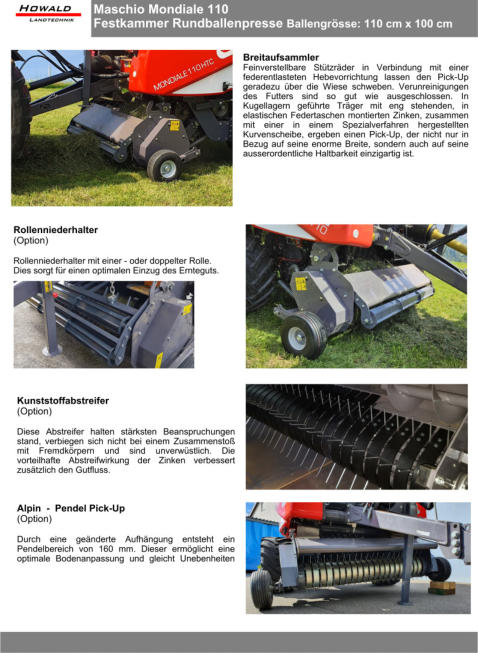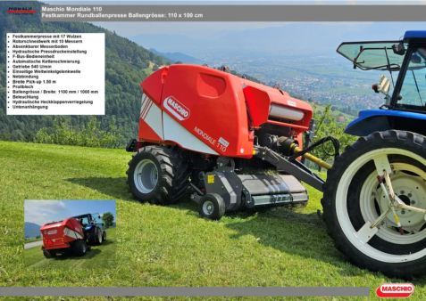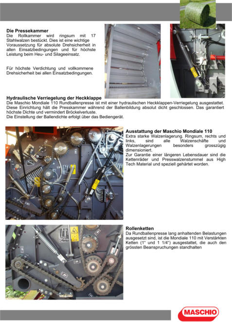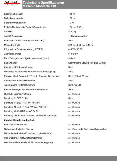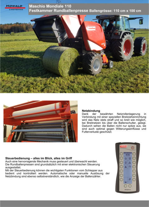 Maschio Mondiale 110 Festkammer Rundballenpresse Ballengrösse: 110 x 100 cm •	Festkammerpresse mit 17 Walzen •	Rotorschneidwerk mit 10 Messern •	Absenkbarer Messerboden •	Hydraulische  Pressdruckeinstellung •	F-Bus-Bedieneinheit •	Automatische Kettenschmierung •	Getriebe 540 U/min •	Einseitige Weitwinkelgelenkwelle •	Netzbindung •	Breite Pick-up 1.50 m •	Prallblech •	Ballengrösse / Breite: 1100 mm / 1000 mm •	Beleuchtung •	Hydraulische Heckklappenverriegelung •	Untenanhängung