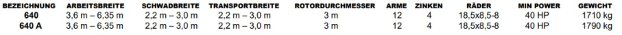 SerienausstattungZapfwelle mit 540 U/min Mittelschwad Standard-Zapfwelle (1” 3/8 Z6)2-Punkt-Aufhängung Automatische Lenkung Einstellbare Arbeitshöhe mitGriff Einstellbare Rotorneigung Einstellbarer SchwadvorhangDreidimensional angelenkte Rotoren mit 3 Rädern und kardanischer AufhängungTangentiales Einklappen der ZinkenarmeSchnell anbringbare abnehmbare Arme mit Stahlkugellagern und verstärkterRotorbefestigung Zinkenstärke 9 mmGetriebe mit Fettschmierung und einstellbarer Zeitsteuerung ErforderlicheSteuergeräte: 1 Einfachwirkend BeleuchtungssatzVERSION 660Hauptrahmenräder 10/80-12Stützräder vor dem Rotor VERSIONEN 760-820Hauptrahmenräder13.0/55-16NockenwellenschutzausStahl Multi-Touch 3. Rad